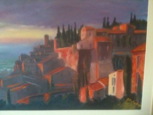 “Orvieto Sunset” and the other images of Italy were contributed by Patrick Delaney, a fellow expat from Dublin, Ireland in the process of building a house in nearby Montecchio. Umbria. Patrick, an architect, has been painting in oils for ten years. He believes good paintings are about light and shade and atmosphere. His favorite artist is Caravaggio – he only wishes he could paint like him. (But mind you, he gets into as much trouble!) For more information about Patrick’s work, you can contact him at delaneypm@eircom.net.